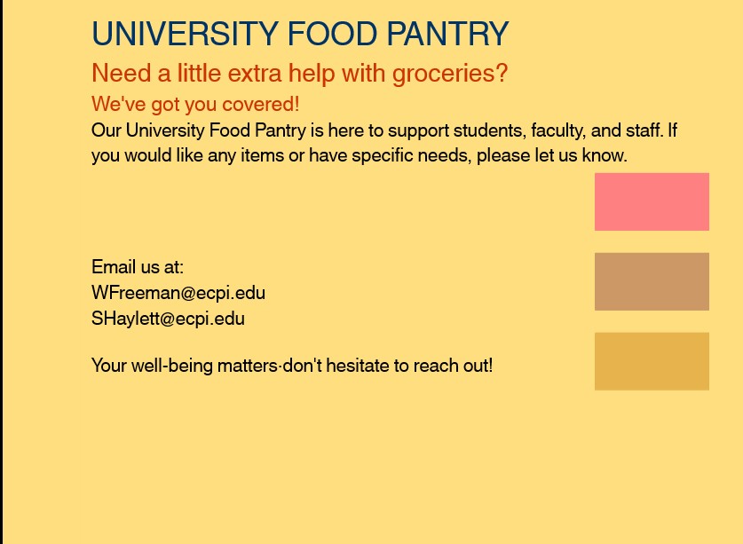 Our University Food Pantry is here to support students, faculty, and staff. If you would like any items or have specific needs, please let us know.